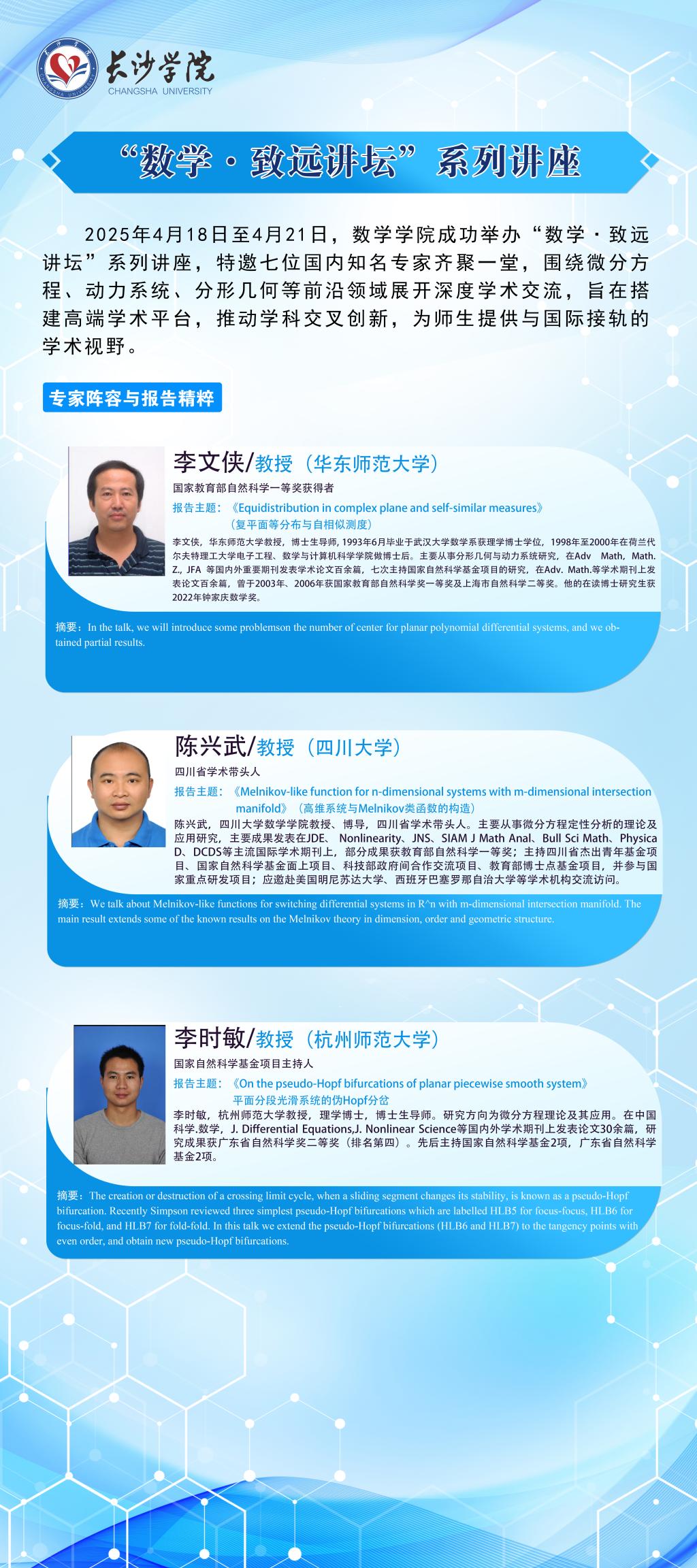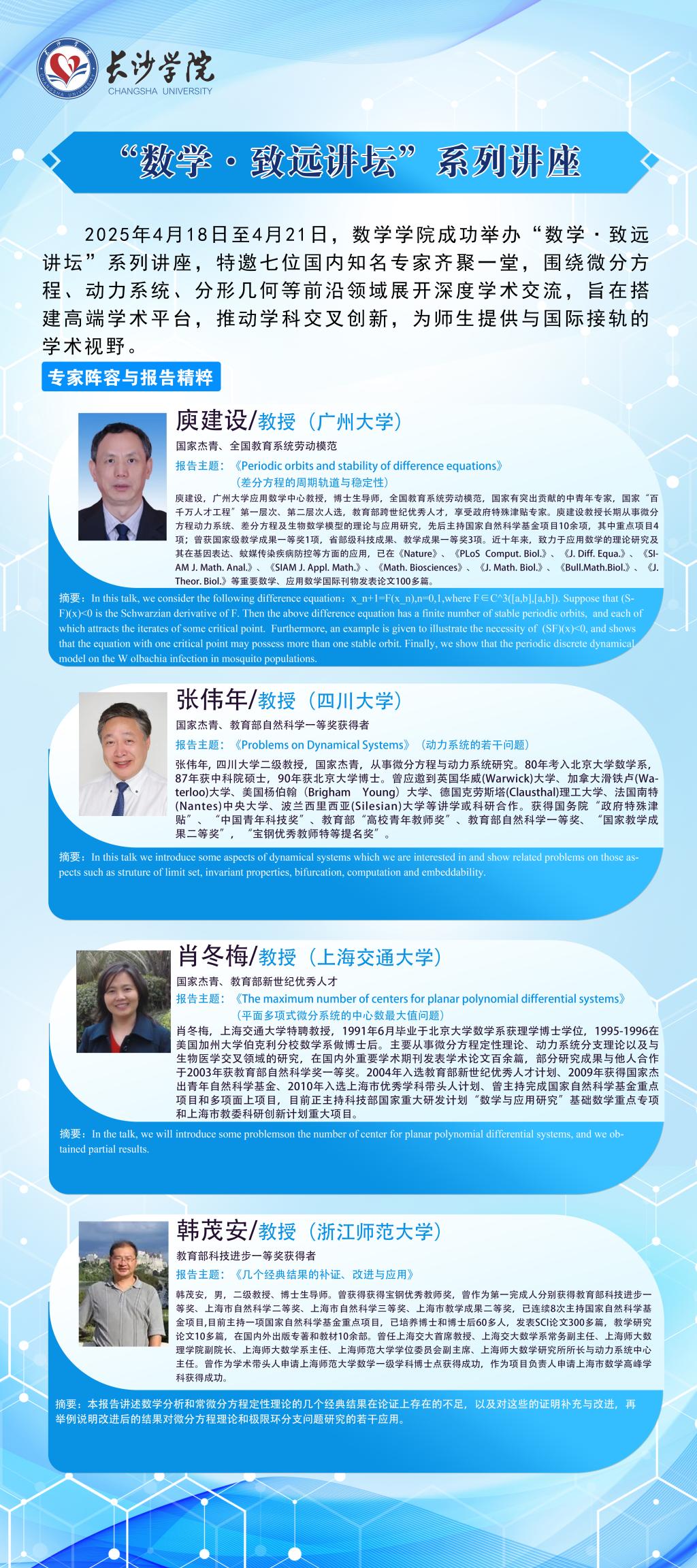 2025年4月18日至21日,数学学院成功举办“数学·致远讲坛”系列讲座,特邀广州大学庾建设教授、上海交通大学肖冬梅教授、四川大学张伟年教授与陈兴武教授、浙江师范大学韩茂安教授、华东师范大学李文侠教授、杭州师范大学李时敏教授做客我校开展“数学·致远讲坛”系列讲座,七位国内知名数学专家齐聚一堂围绕微分方程、动力系统、分形几何等前沿领域展开深度学术交流,旨在搭建高端学术平台,推动学科交叉创新,为师生提供与国际接轨的学术视野。讲座由数学学院院长张玲玲教授主持,学院师生以及湖南大学、长沙理工大学的部分老师和研究生参加本次学术活动。