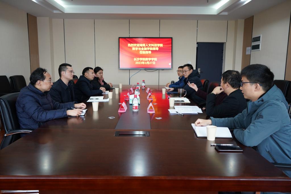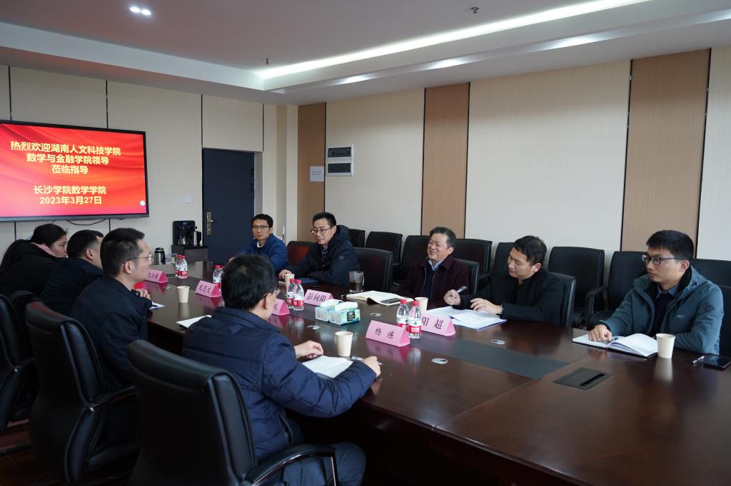 湖南人文科技学院数学与金融学院院长李军成、副院长龙志文、教研室主任杨炼、史卫娟一行四人,为交流学习两校在学科建设方面的经验和做法,于3月27日下午赴我校数学学院进行调研学习。我院出席此次交流会议的有:党总支书记谭义红、数学学院院长彭向阳、副院长阳超,及教研室主任陈翰麟、科研秘书费明发。会上,彭向阳院长对李军成一行表示热烈欢迎,并对数学学院学院概况、学科建设及重要科研项目申报工作进行了简要概述。