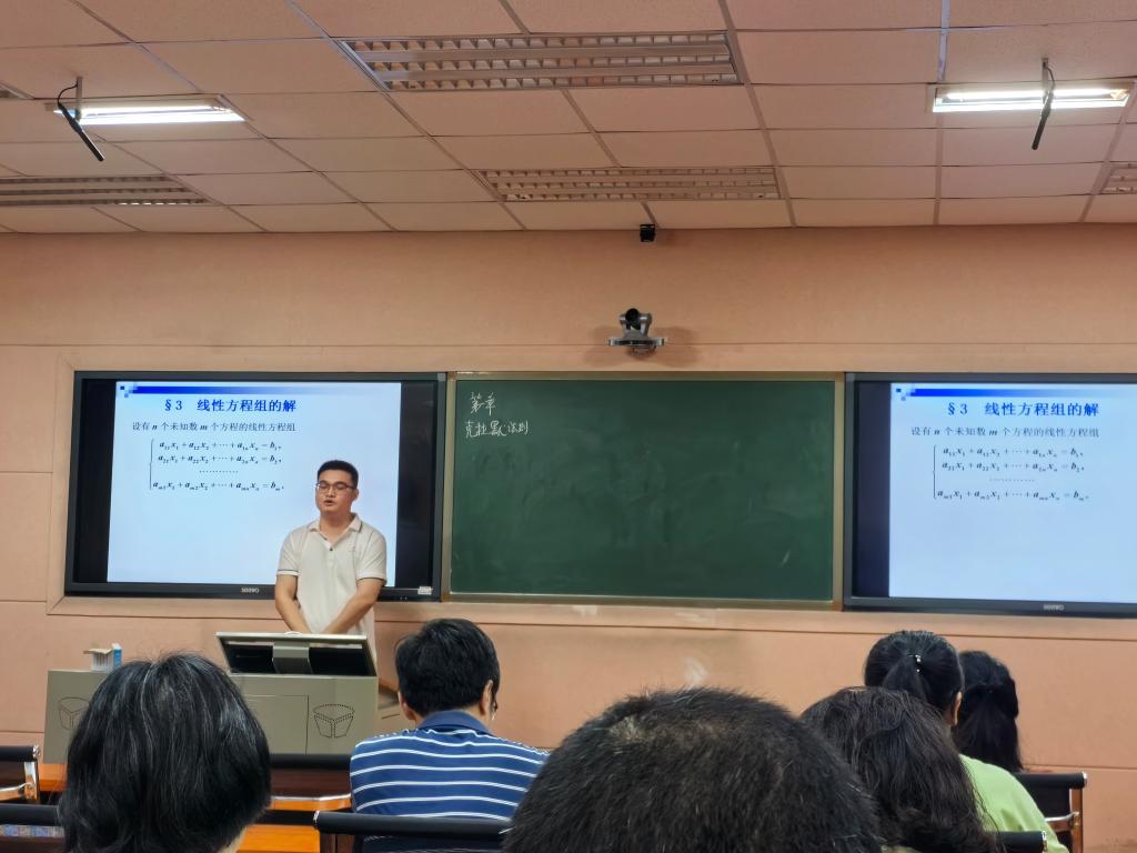 首先刘常峰博士讲述了《线性代数》中线性方程组的求解。刘老师教学准备充分、板书工整、声音洪亮、重难点突出,知识点讲解清晰透彻。然后作为创新大赛一等奖选手获得者张逵老师展示了参加湖南省第四届课程创新大赛的决赛过程和参赛经验分享。张老师围绕让学生“想建模,会建模,用好建模”课程建设目标,流畅生动的语言表达《数学建模》课程创新实践。其先进的教学理念、精美的课件赢得了老师们的高度赞赏!