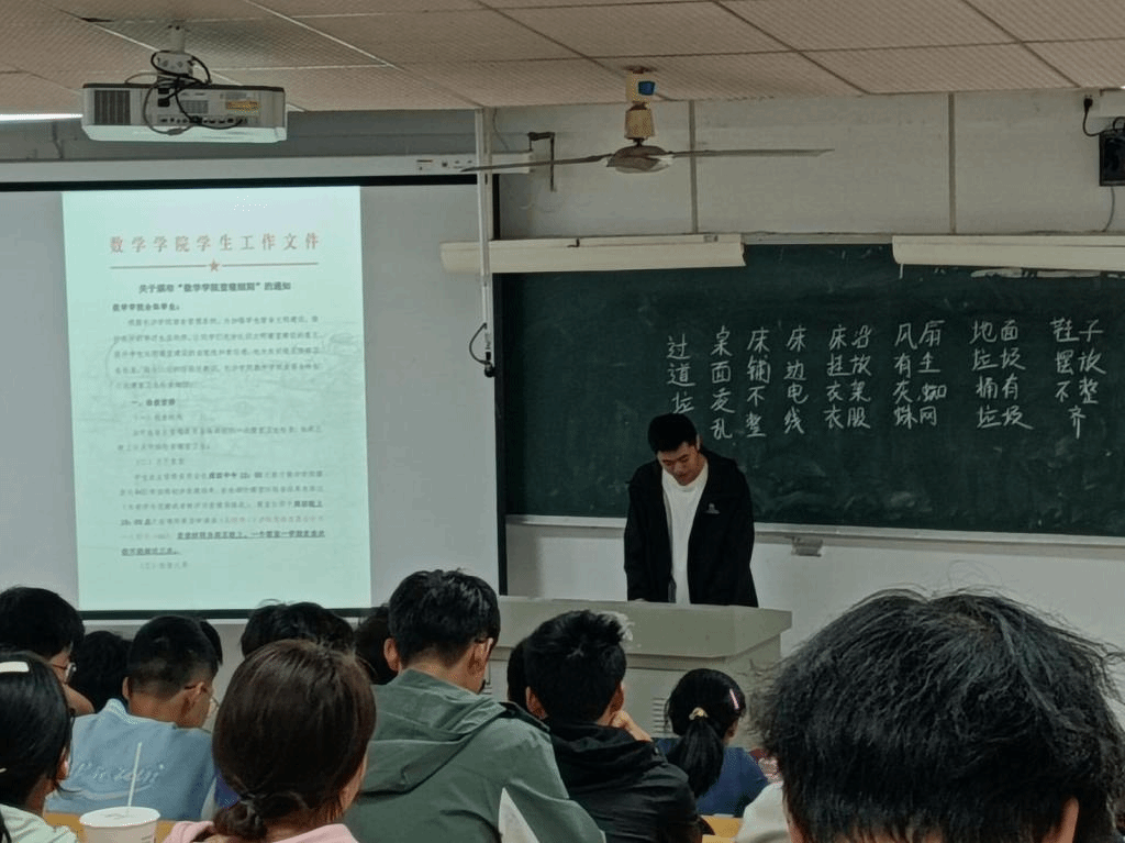 2024年10月8日下午四点半,数学学院在致远楼北栋3001教室召开了本学期第一次寝室长及生活委员会议。主持,数学学院学工办主任王思永老师、自委会会长贺云和崔智绮、罗韦韦参加了本次会议。