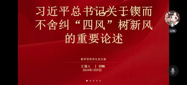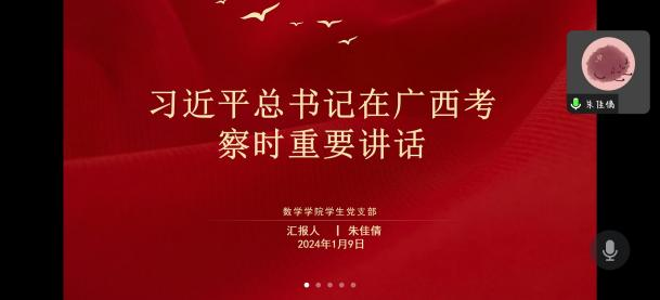 1月9日晚上8点,数学学院学生党支部组织开展党日活动,本次主题活动采取线上方式召开,支部党员们先后就“习近平总书记关于锲而不舍纠“四风”树新风的重要论述”、“习近平总书记在广西考察时重要讲话”两方面内容开展研讨学习。