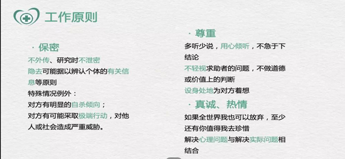 尊重:多听少说,用心倾听,不急于下结论,不轻视求助者的问题,不做道德或价值上的判断。设身处地为对方着想。真诚、热情,如果全世界我也可以放弃,至少还有你值得我去珍惜。解决心理问题与解决实际问题相结合。